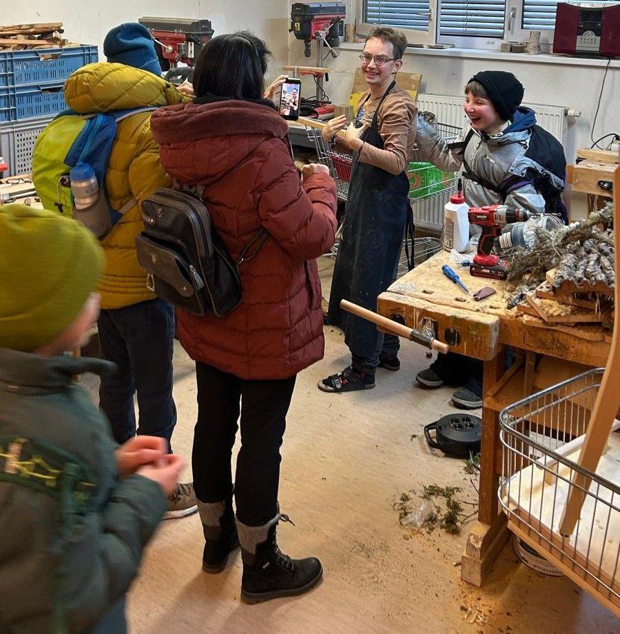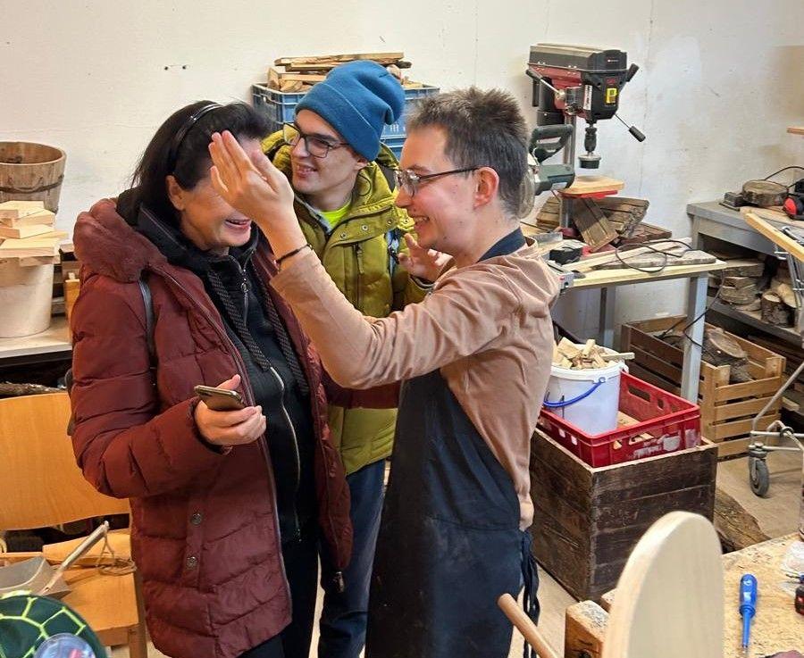 Voller Vorfreude betraten sie das Gebäude und konnten es kaum erwarten, David endlich zu sehen. Dani und Lukas, die zuständigen Betreuer von David begrüßten die Gruppe sehr herzlich und führten sie zum Arbeitsraum von David. Nach einem leisen Klopfen betraten sie den Raum und staunten nicht schlecht. David war hochkonzentriert und mit großem Eifer bei der Arbeit. Erst nach einiger Zeit bemerkte er die Besucher. Die Stimmung im Raum änderte sich schlagartig. Ein wahres Feuerwerk der Freude brach aus.