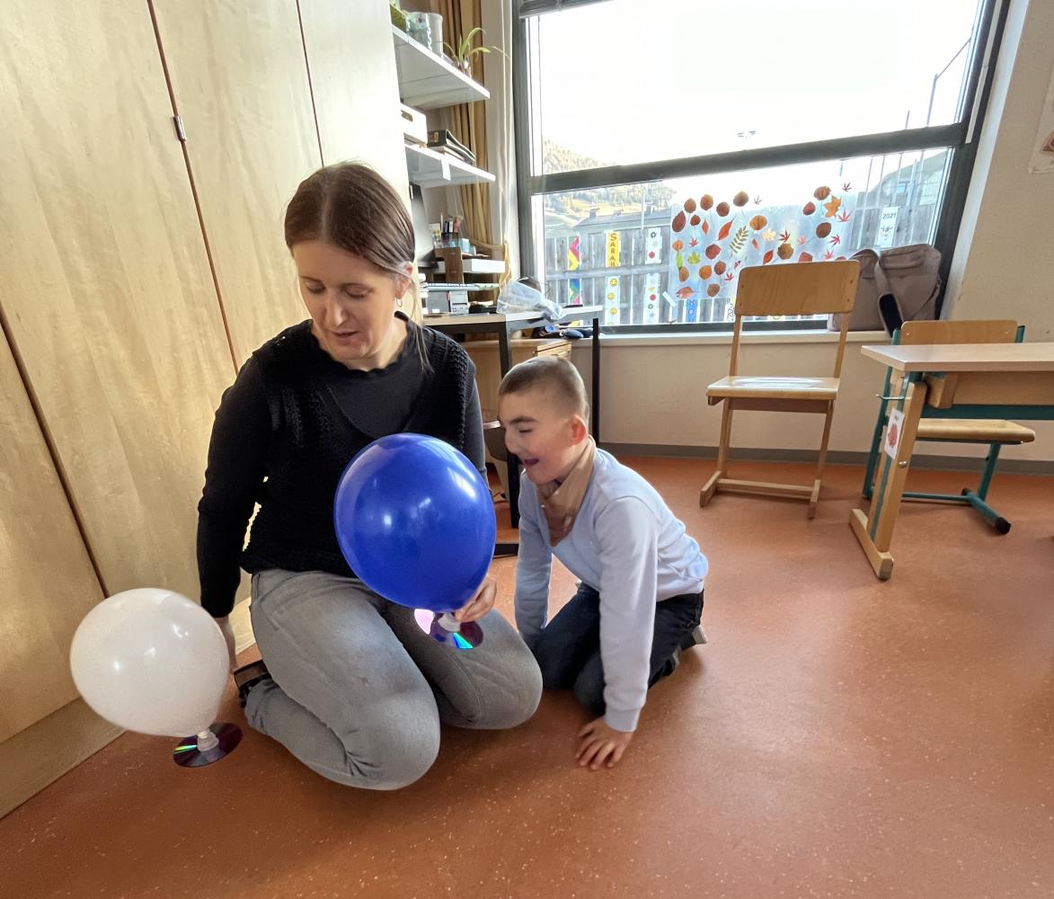 Zum Thema Licht faszinierten uns ein selbst gebastelter Bild-Projektor, der in einem abgedunkelten Raum lustige Bilder und wandelnde Sterne an die Wand zauberte, ebenso wie bunte Leuchtfäden oder die verborgenen Zeichen, die erst mit einer Taschenlampe sichtbar wurden. Beim Experimentieren mit Luft waren die Luftballonrakete und der singende Luftballon die Highlights. Ein weiterer Lerninhalt war der Magnetismus, zu dem interessante Versuche mit verschiedenen Materialien sowie lustige Magnetspiele durchgeführt wurden. Zum Thema Wasser wurde ein passendes Lied gesungen und es gab effektvolle Experimente wie die Erzeugung von Wasserwirbeln oder die Herstellung einer Wasserraupe aus einem Taschentuch.