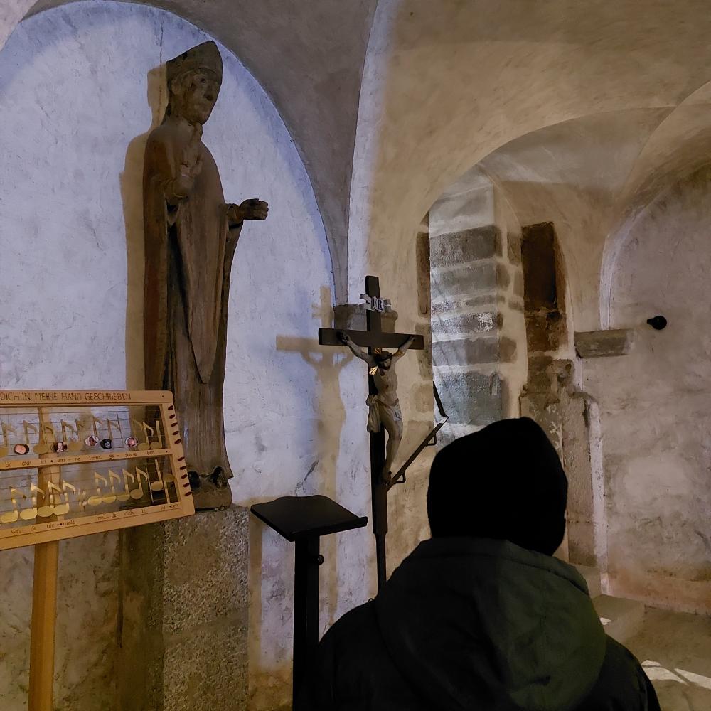 Im Vorfeld eigneten sie sich mit viel Fleiß und Interesse geschichtliches Wissen rund um den Dom an und versuchten außerdem, das ehrwürdige Gebäude mithilfe einer Anleitung zu zeichnen. Weiters übten die Kinder italienische Vokabeln, die sie stolz vor Ort anwenden konnten. Besonders spannend fanden die Jungs die Sage vom Riesen Haunold: So begaben sie sich im Dom voller Neugier auf die Suche nach der „Rippe vom Riesen“. Der Wow-Effekt über die Größe der Rippe war groß. Überrascht waren die Schüler auch vom großen Holzkreuz im Altarbereich, auf dem Jesus eine Goldkrone und nicht wie üblich eine Dornenkrone trägt. Weiters wurde auch nach dem Kuppelfresko mit den vielen Sternen, den beiden Kirchenpatronen St. Candidus und St. Korbinian Ausschau gehalten, bevor es hinunter in die Krypta ging.