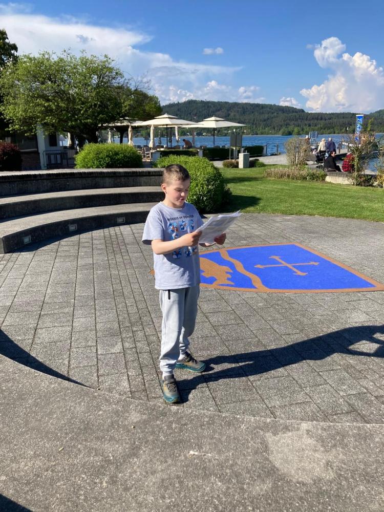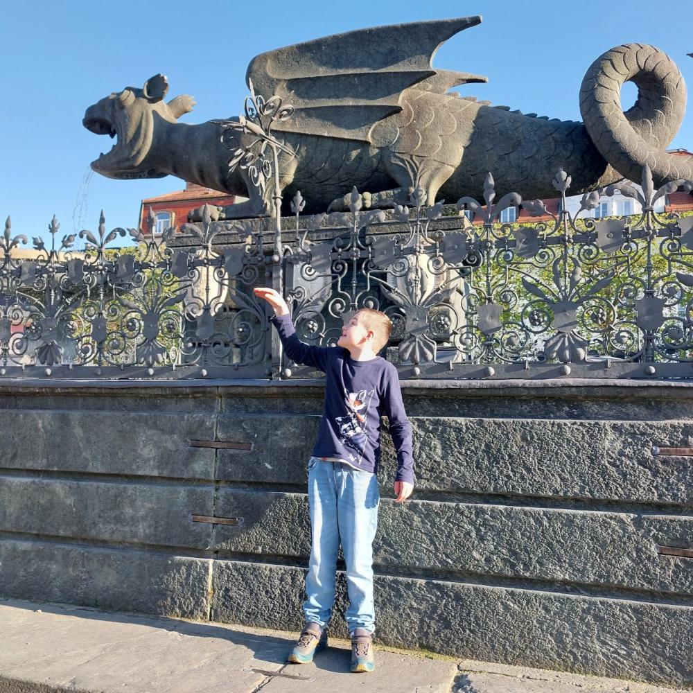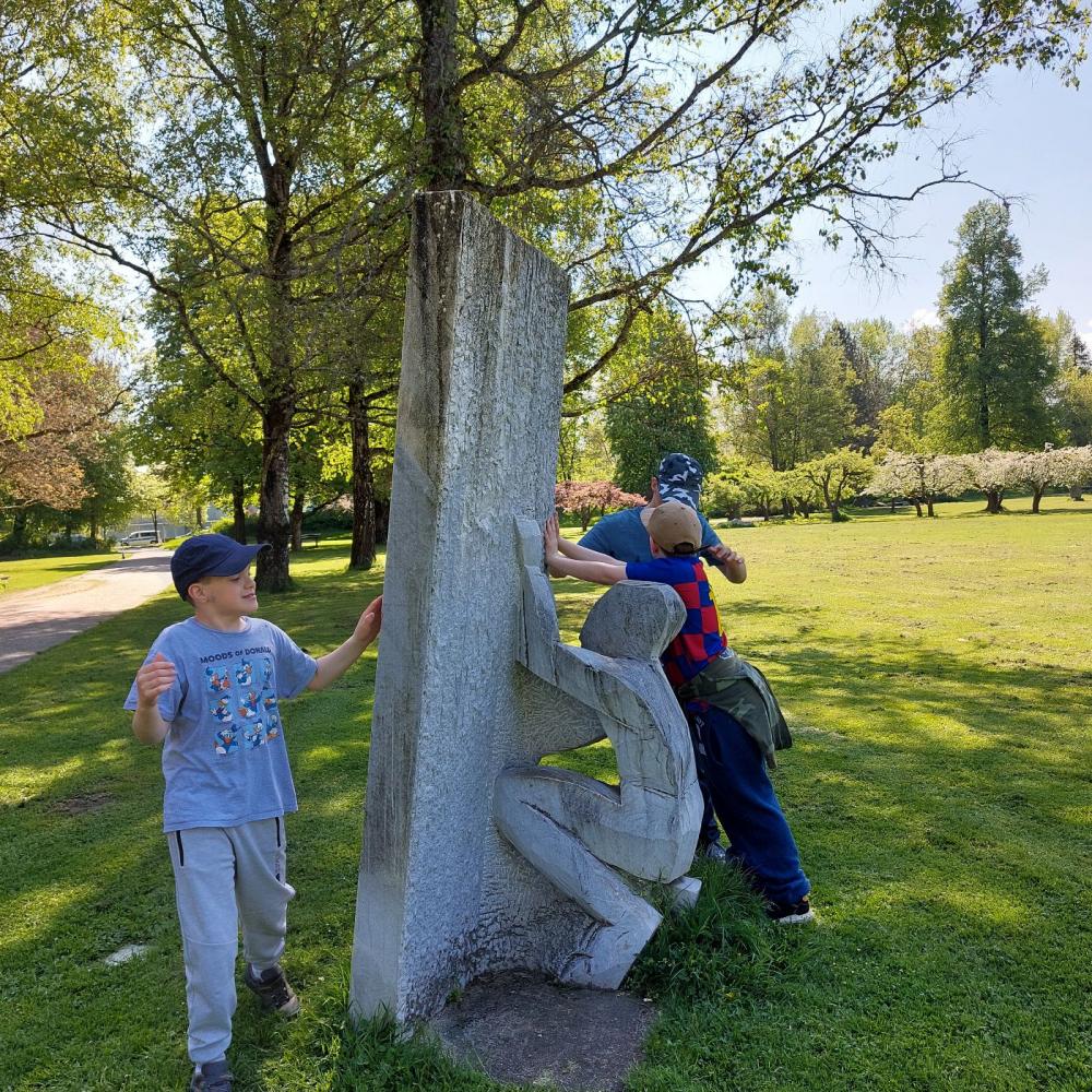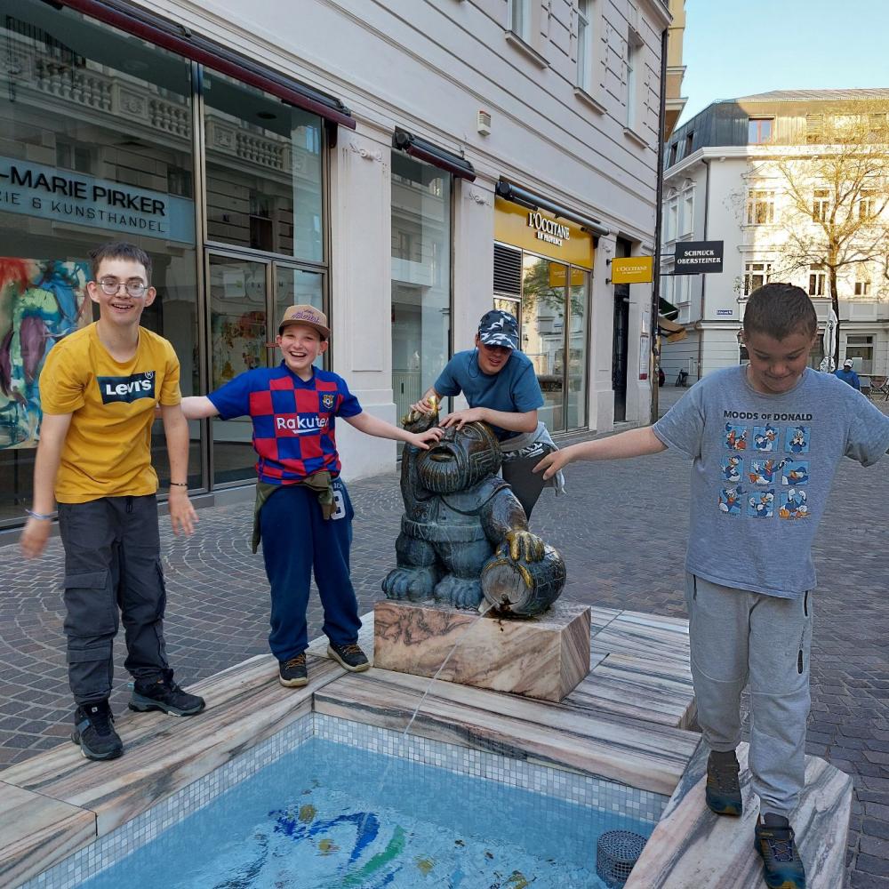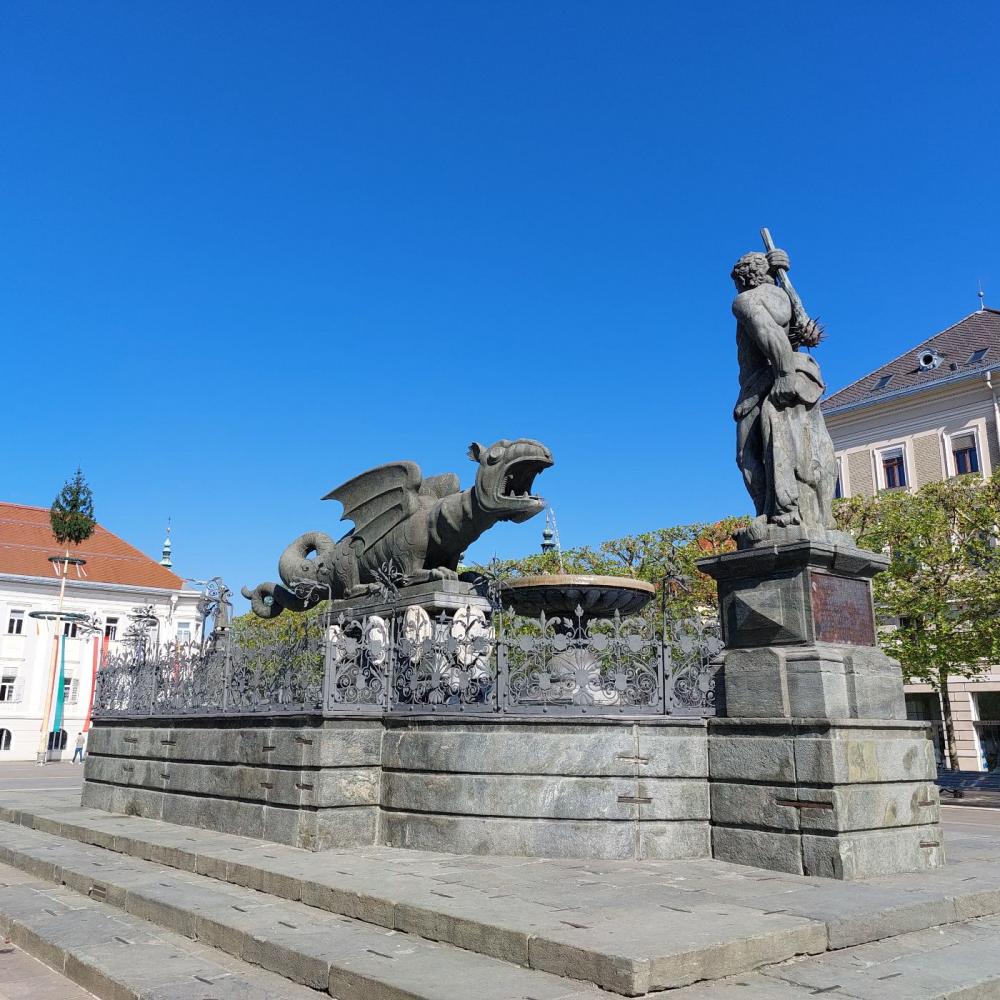 Im Europapark wurde Zeit zum freien Spielen, Entspannen auf Hängematten und dem Suchen von Skulpturen eingeräumt. Am Neuen Platz, genau gegenüber vom Hotel, konnte der Lindwurm in aller Größe bestaunt werden. Dabei hatten die Schüler noch mehr Freude, als sie die Sage vom Lindwurm bis ins kleinste Detail genau und spannend erzählten.