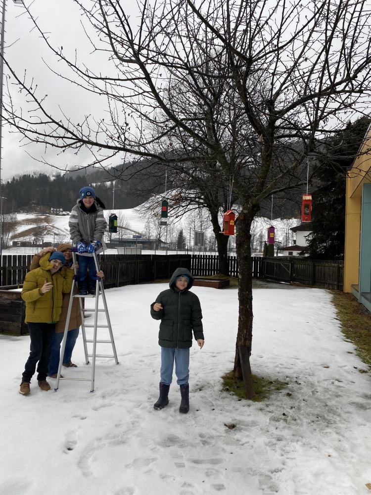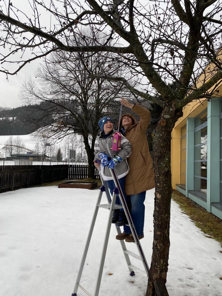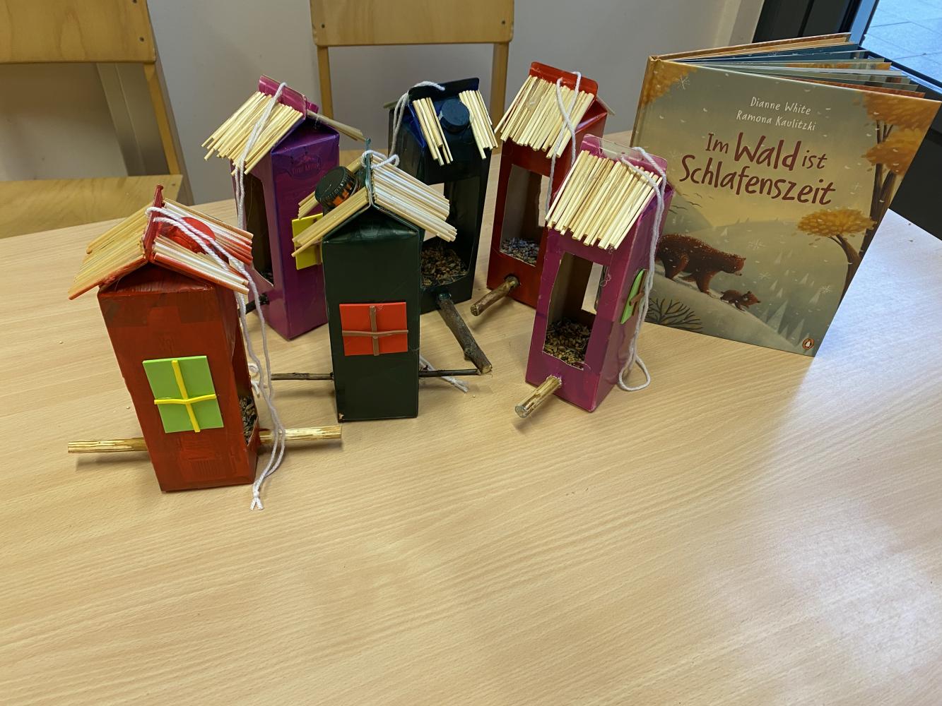 Ein besonderes Highlight war das Basteln mehrerer Vogelhäuser. So helfen die Kinder aktiv mit, Vögeln im Winter eine Futterstelle zu bieten. Beim Aufhängen des Vogelhauses im Garten wurden die kleinen Naturforscher bereits neugierig - welche Vögel würden wohl bald zu Besuch kommen?